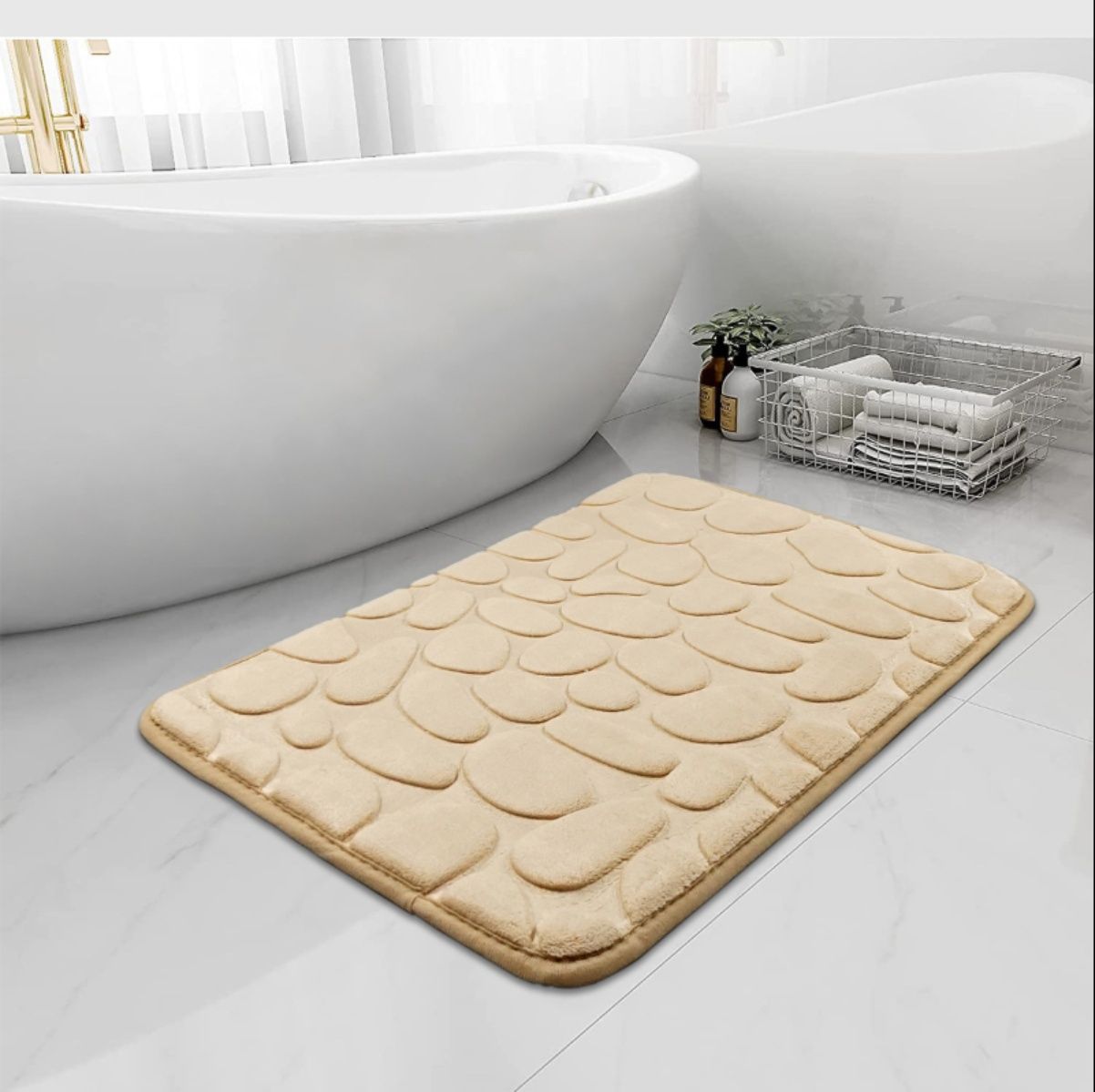 小石を敷き詰めたような立体的な凹凸デザインが特徴のタオル地バスマットです。 ふかふかとした厚みのある素材が足裏を優しく包み込み、バスルームに心地よい癒しの空間を演出します。 吸水性に優れたタオル地素材を使用しており、お風呂上がりの濡れた足元をしっかりと吸水します。 クッション性が高く、足への負担を軽減しながら快適な踏み心地を実現したバスマットです。