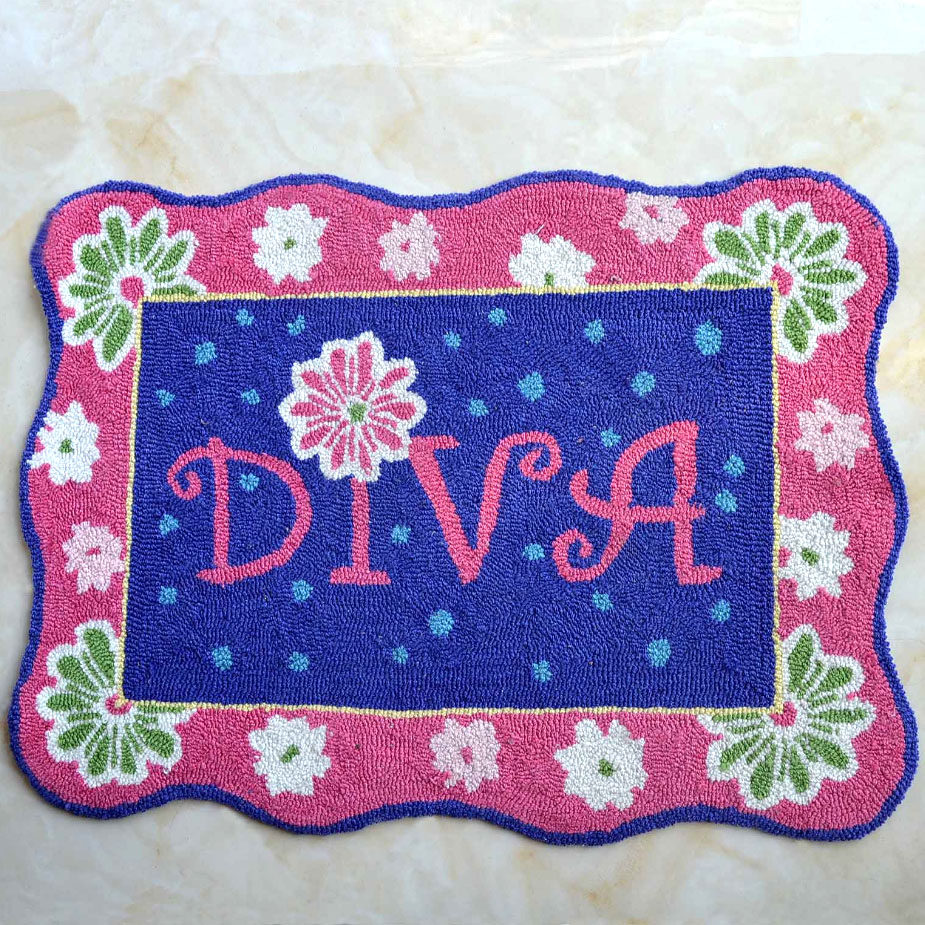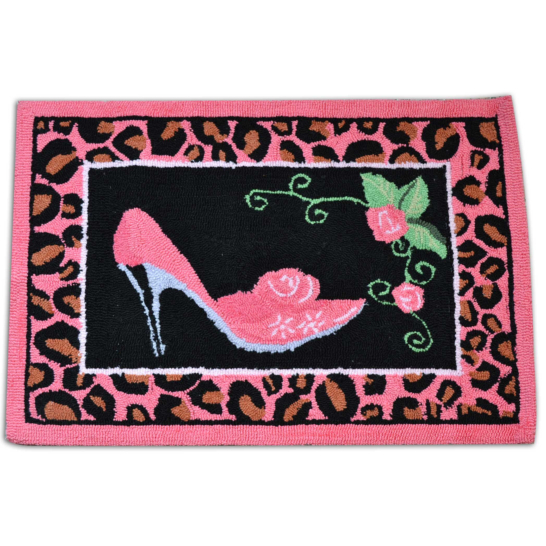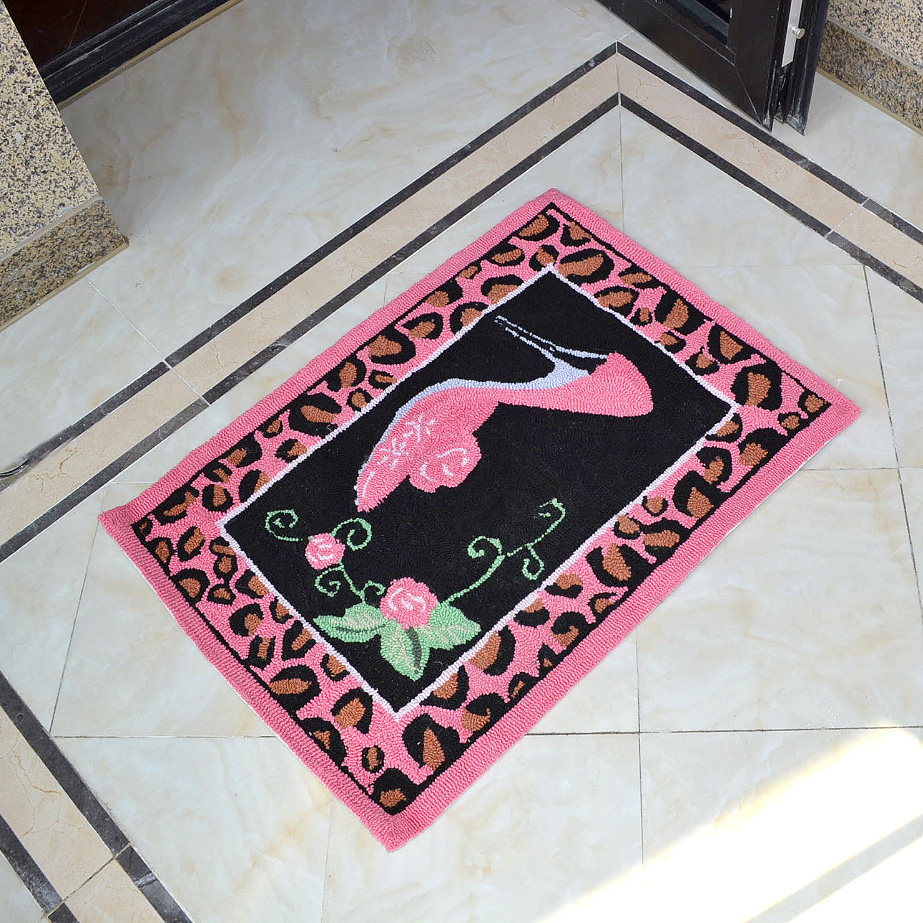 華やかなハイヒールと薔薇の刺繍が目を引く、タオル地のバスマットです。